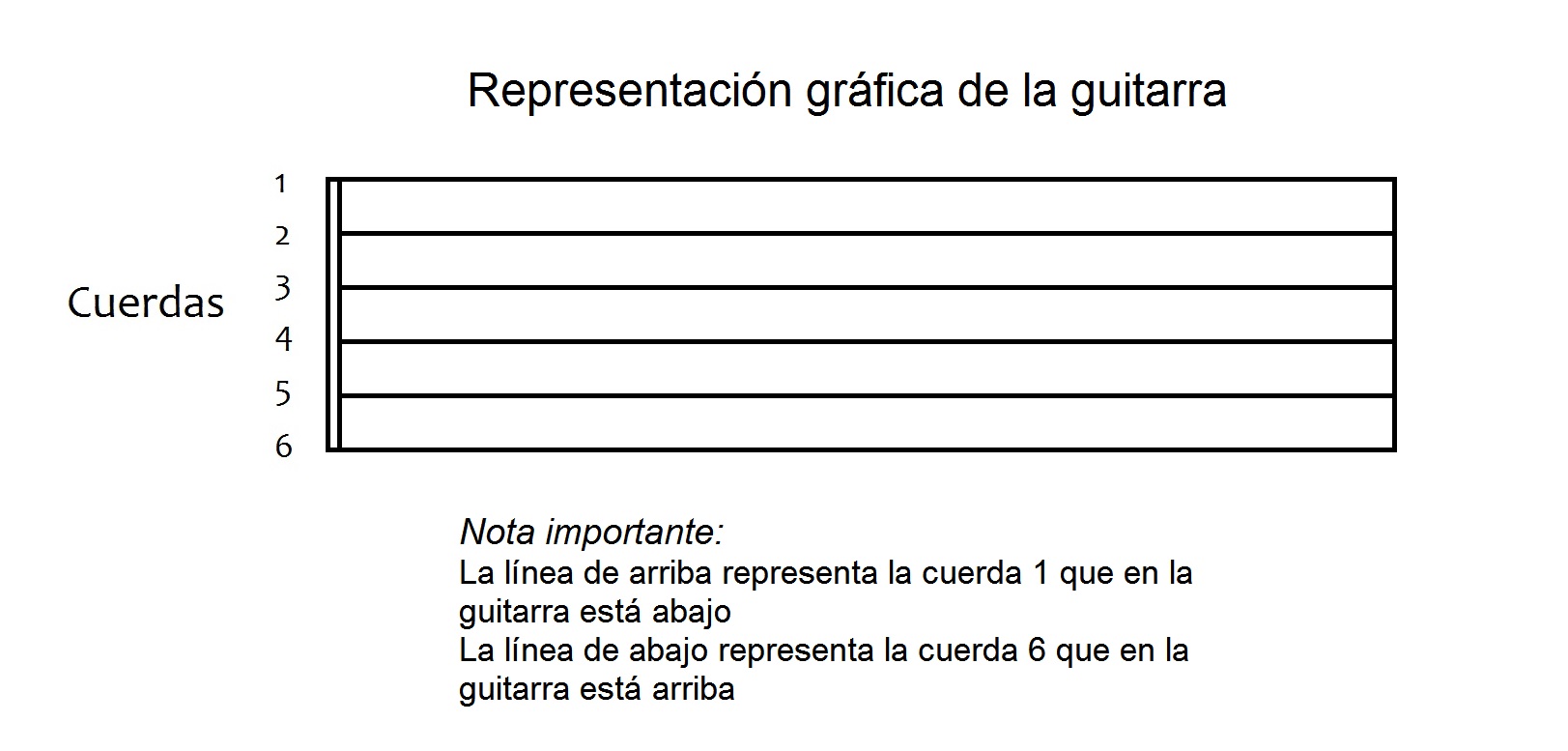 A continuación tenemos las cuerdas 2, 3 , 4 , 5 y 6. La cuerda 6 que en la guitarra está arriba, en la representación gráfica se situará abajo, ya que es una cuerda grave.