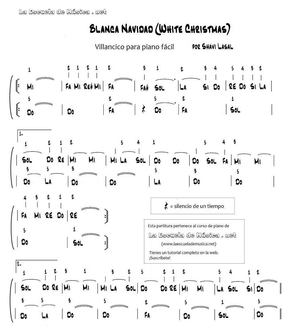 En esta partitura, al igual que para las otras canciones de navidad para piano, tenemos escritas las notas de la melodía. Es una forma simplificada de escribir música, pero muy efectiva. No es tan perfeccionada como la escritura musical tradicional, pero nos aporta muchos datos útiles. Tenemos las notas, los compases, la duración de cada nota y la digitación. También podemos estudiar la mano derecha y la mano izquierda por separado.